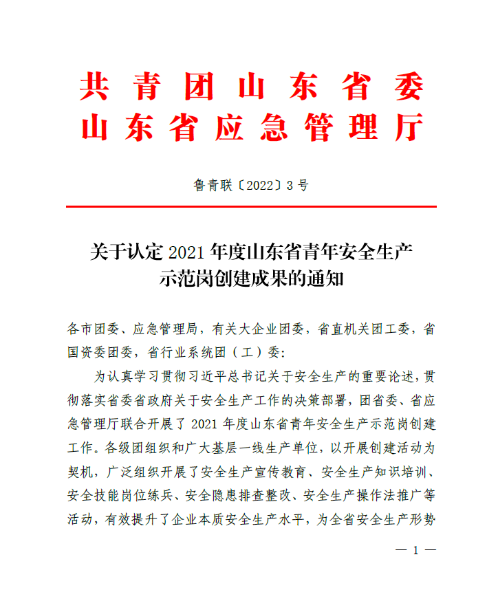 1月5日,“2021年度山东省青年安全生产示范岗”评选结果揭晓,伟德国际1949集团旗下沂南力诺太阳能电力工程有限公司荣获“山东省青年安全生产示范岗”荣誉称号。