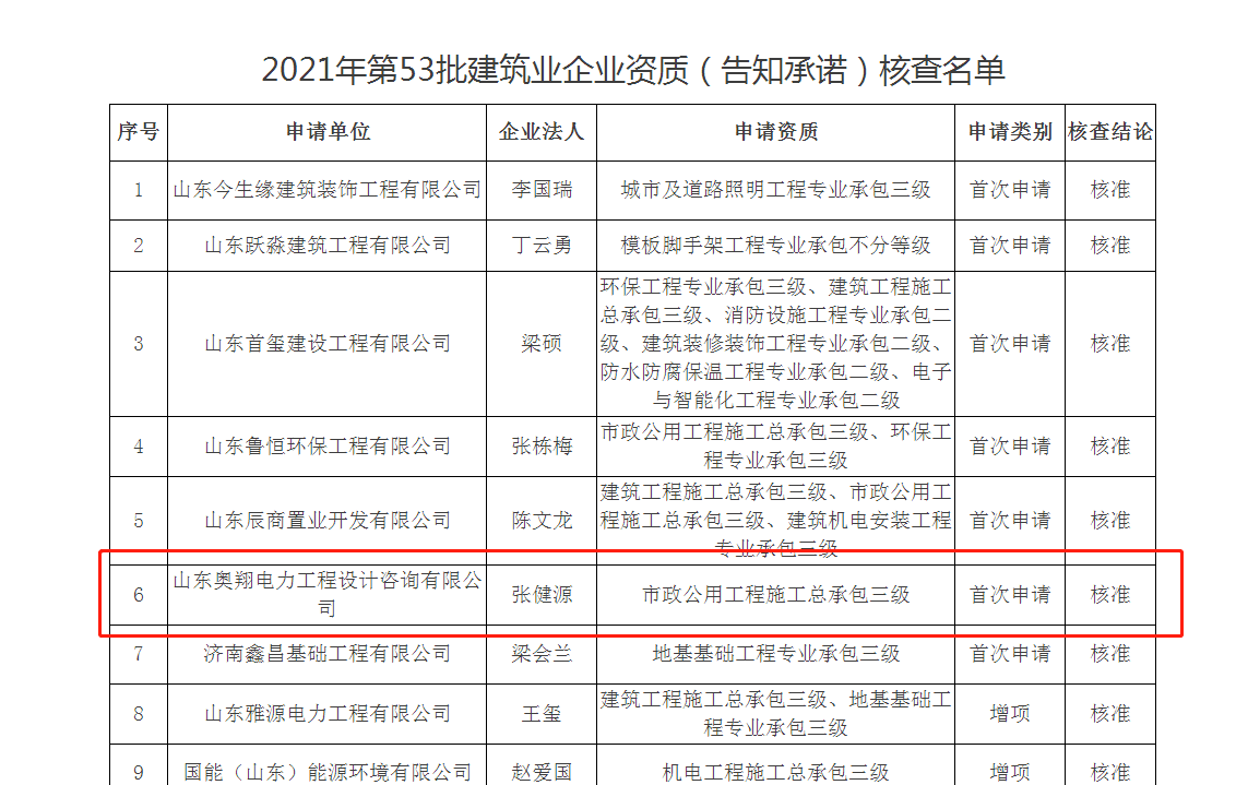 近日,济南市行政审批服务局发布《关于2021年第53批建筑业企业资质(告知承诺)核查名单的通告》,山东奥翔电力工程设计咨询有限公司获得由济南市行政审批服务局颁发的电力工程施工总承包三级资质。